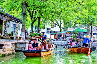 游客坐船游览同里古镇美景。资料图片