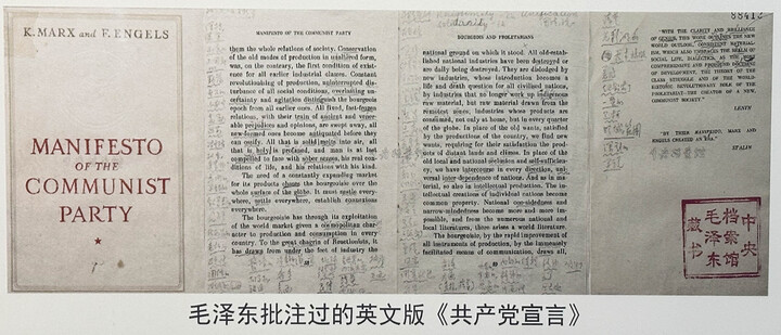 习近平总书记曾指出,我们党的老一辈革命家都是受《共产党宣言》的影响而走上革命道路的。1936年,毛泽东同志在接受美国记者埃德加·斯诺采访时回忆,“有三本书特别深刻地铭记在我的心中,使我树立起对马克思主义的信仰”。这三本书分别是《共产党宣言》《阶级争斗》《社会主义史》。本次展览中展出了毛泽东同志亲手批注的英文版《共产党宣言》,上面写满了密密麻麻的笔记,非常特殊和珍贵。