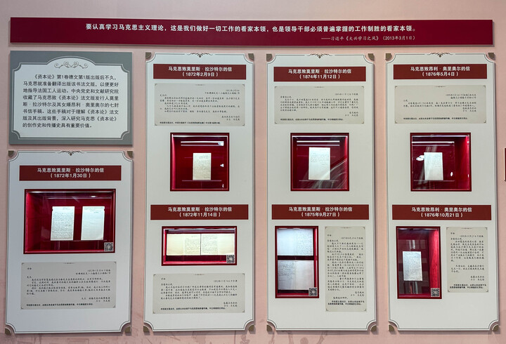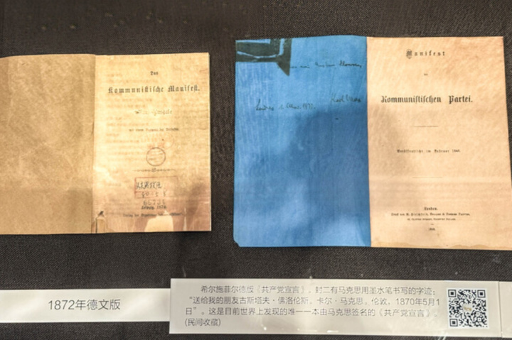 此次还展出了马克思恩格斯在不同时期为《共产党宣言》撰写的七篇序言,中共中央编译局先后编译的两版《资本论》中文全译本等。