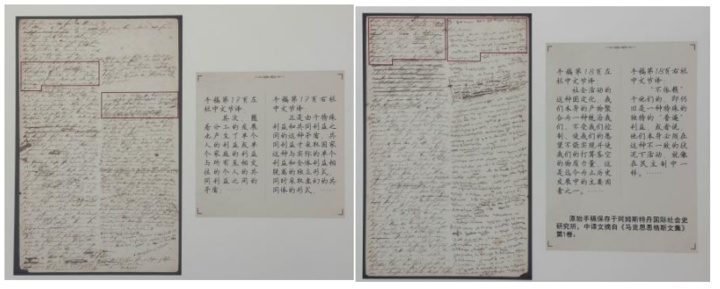 第二部分“手稿藏书 经久弥珍”,展出了15份马克思、恩格斯的原始手稿,它们是马克思主义经典著作编纂工作的文献源头,具有极为珍贵的文献价值和文物价值。