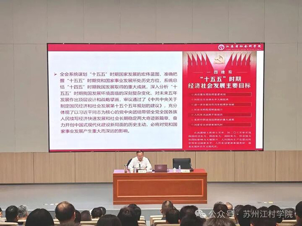 江苏省社科院党委书记、院长尚庆飞应邀作《深入学习党的二十届四中全会精神 科学谋划“十五五”规划》主题授课。他从五年规划编制的传统优势和时代价值、“十四五”规划的完成情况、“十五五”时期我们国家面临的形势与任务、江苏做好“十五五”规划的重点领域和重点问题几个方面深刻阐释了全会的历史意义与现实价值,并结合“十五五”时期“夯实基础、全面发力”的关键定位,就江苏“十五五”时期需要关注“科技创新与产业升级”“城乡融合与区域协调”“绿色转型与绿色发展”“深化改革与对外开放”“民生保障与社会发展”等重要领域和重点问题提出了具体建议。